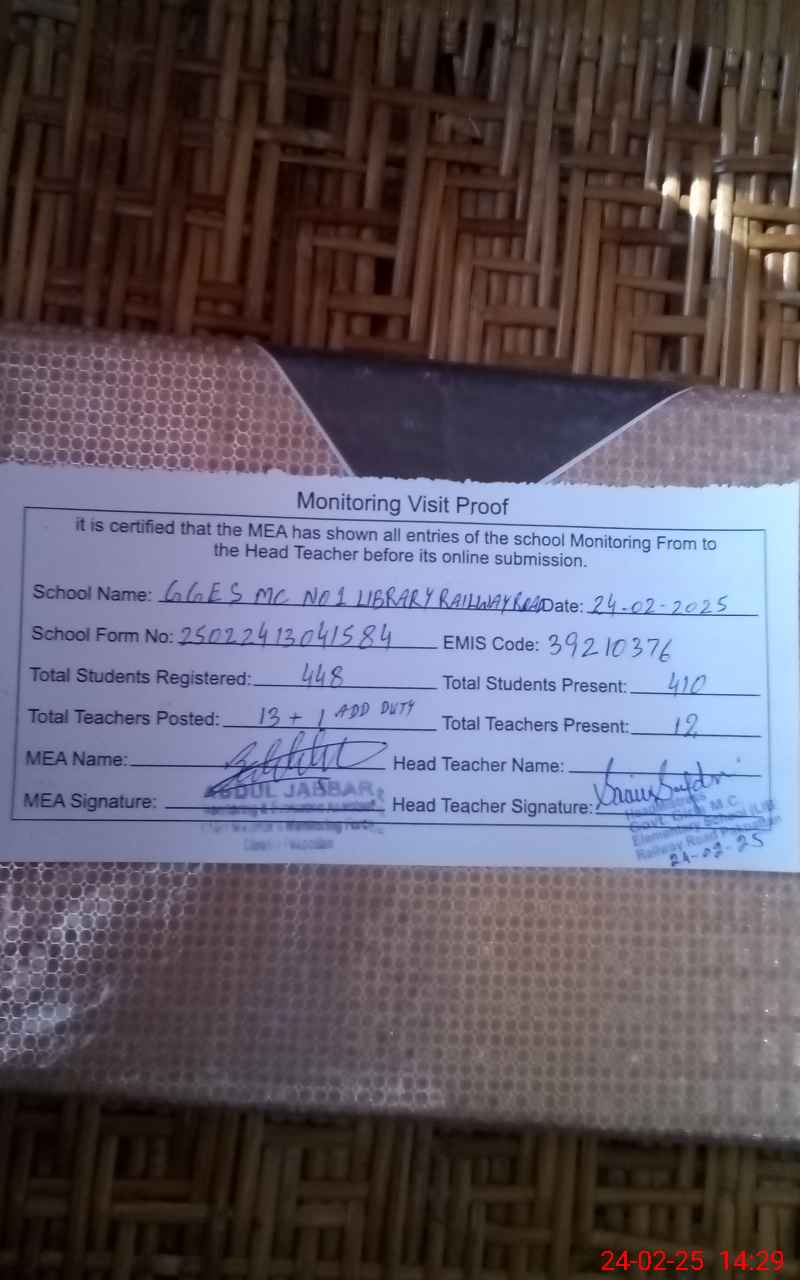 | EMIS Code: 39210376 | Name of School: GGES MC NO. 1 LIBRARY RAILWAY ROAD | |||