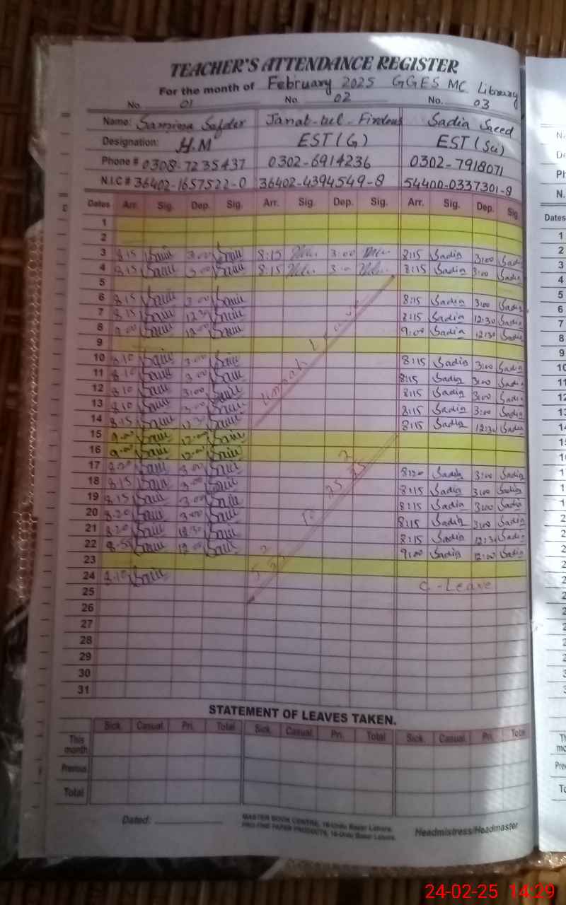 | CNIC | Full Name | Designation | R/C | Absence During Last Calender Month |