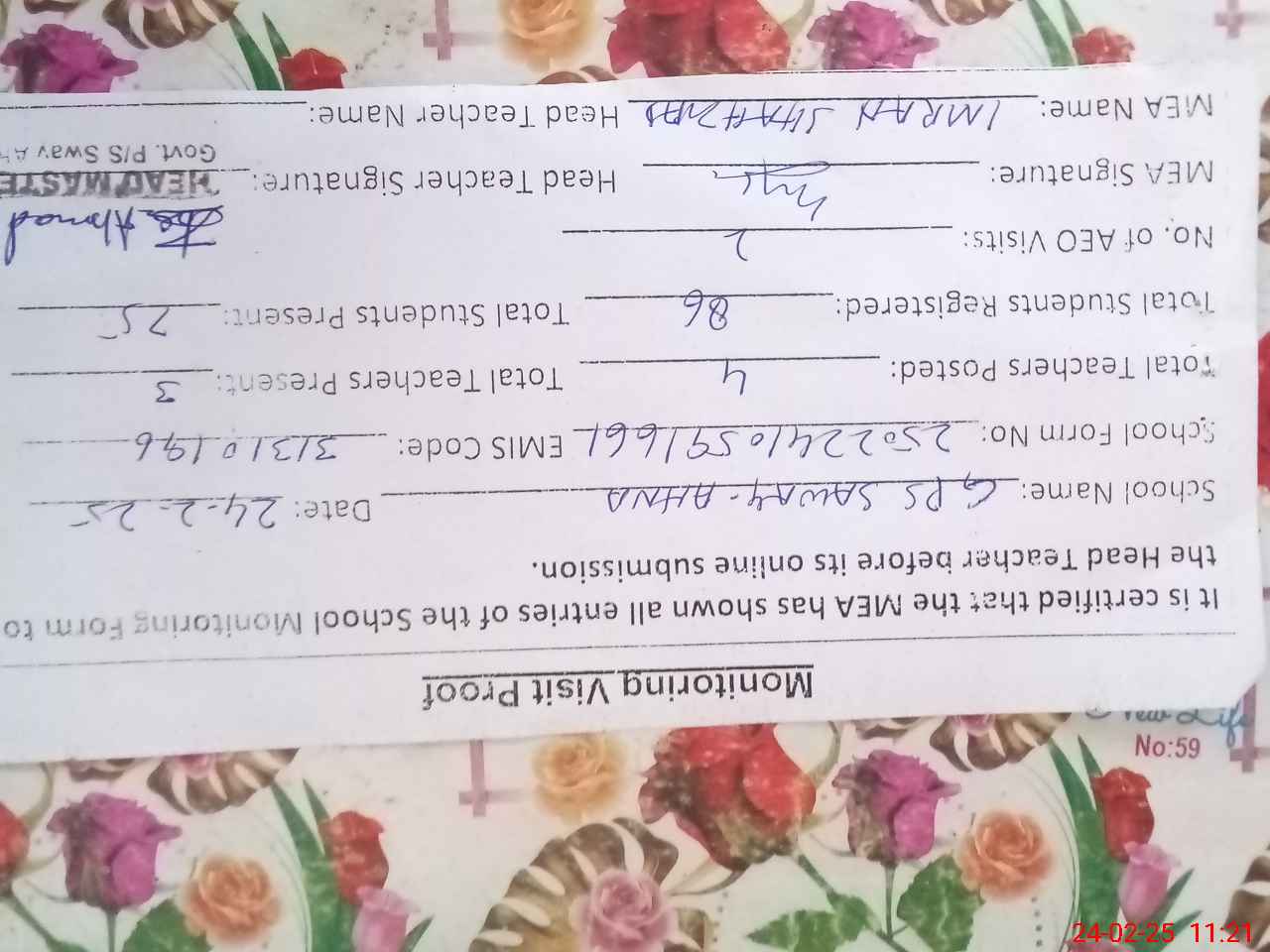 | Certified that this School was Inspected by the Undersigned MEA/DMO Today and the Information Stated Above is as Per Record. | |||||