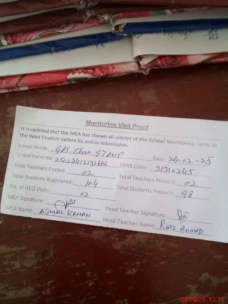 | Attendance Register | Head Teacher | MEA with School | Visit Proof |