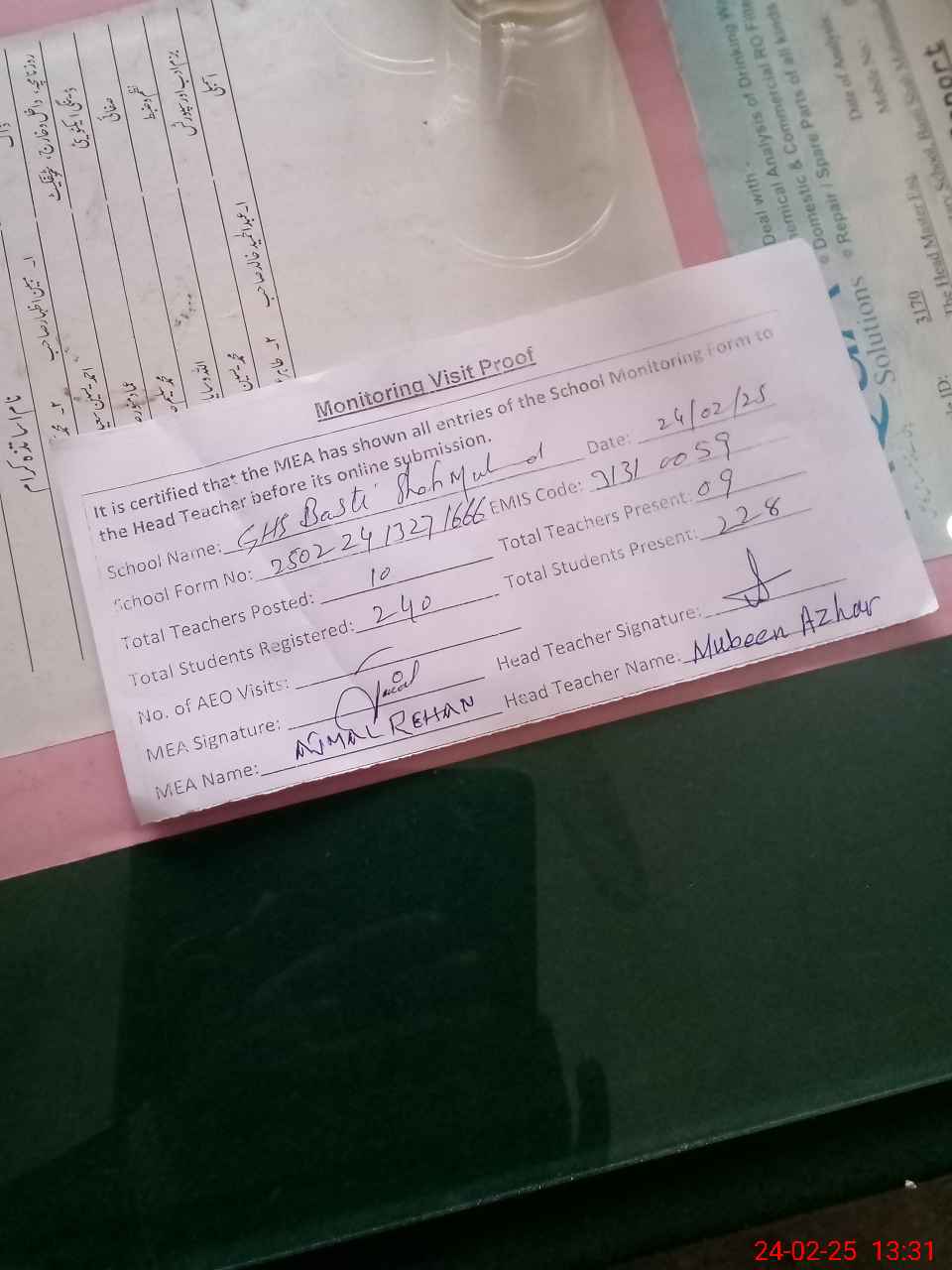 | Attendance Register | Head Teacher | MEA with School | Visit Proof |