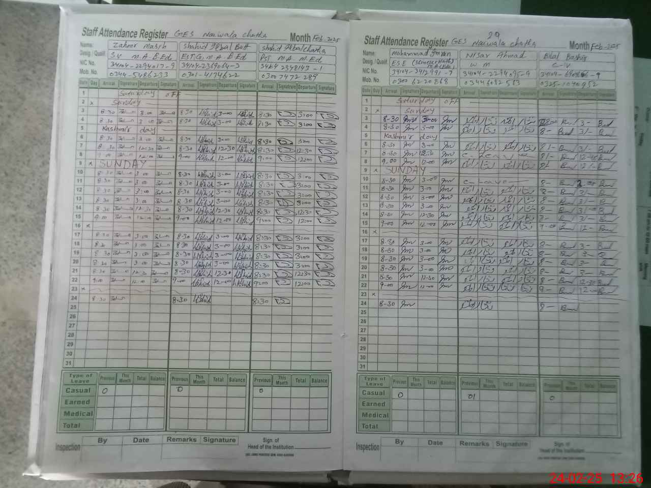 | CNIC | Full Name | Designation | R/C | Absence During Last Calender Month |