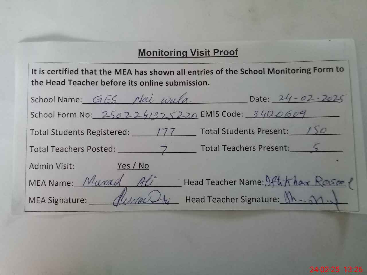 | Attendance Register | Head Teacher | MEA with School | Visit Proof |