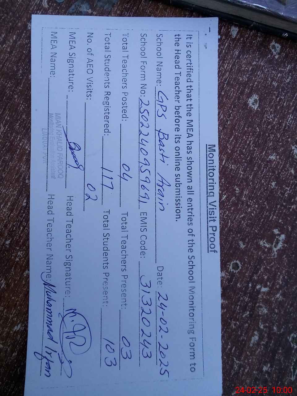 | Attendance Register | Head Teacher | MEA with School | Visit Proof |