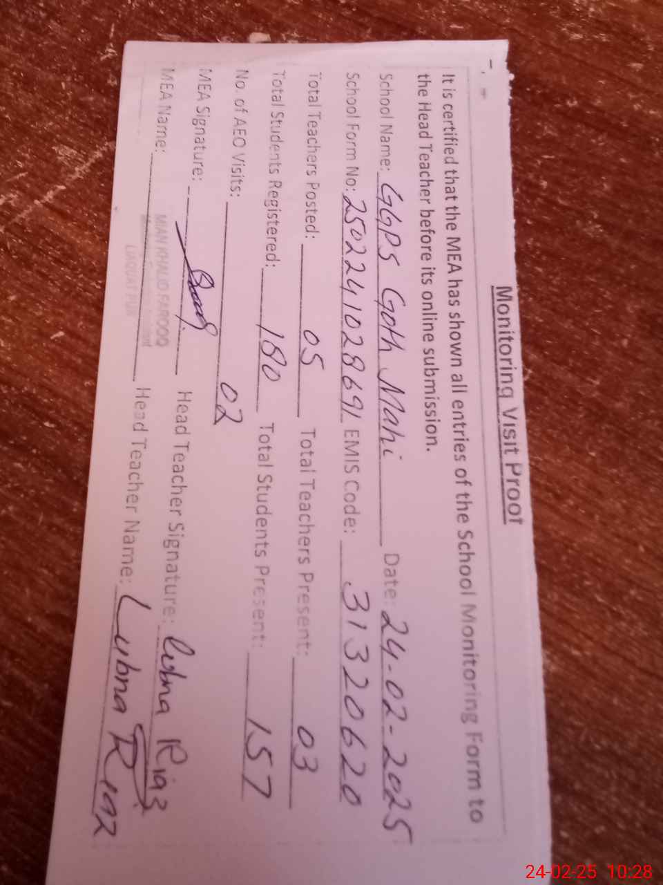 | Attendance Register | Head Teacher | MEA with School | Visit Proof |