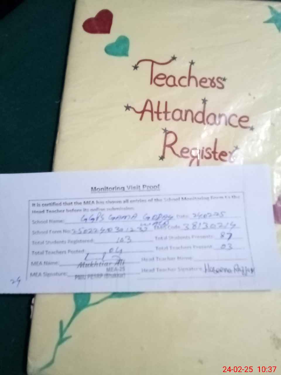 | Attendance Register | Head Teacher | MEA with School | Visit Proof |