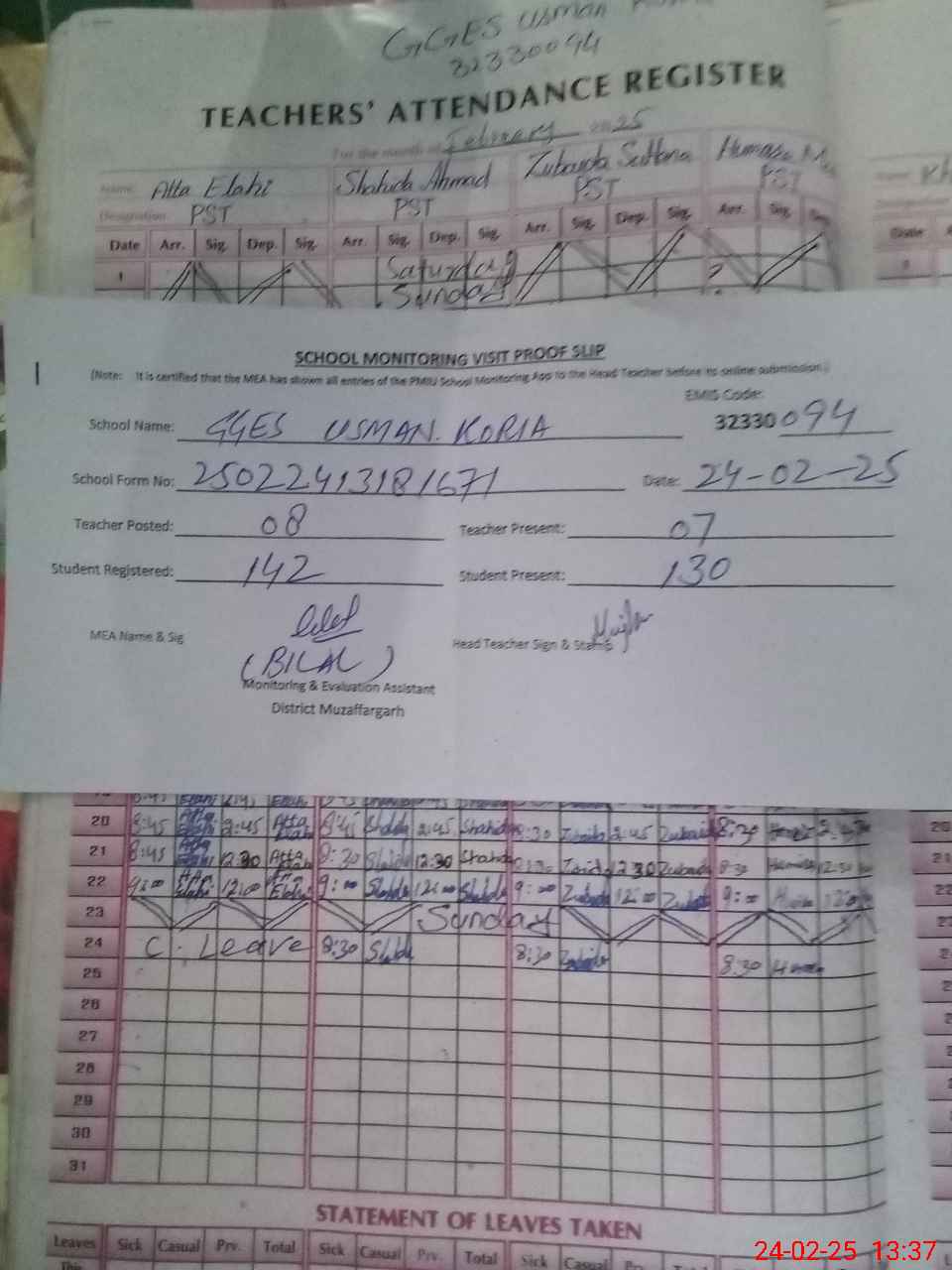| Attendance Register | Head Teacher | MEA with School | Visit Proof |