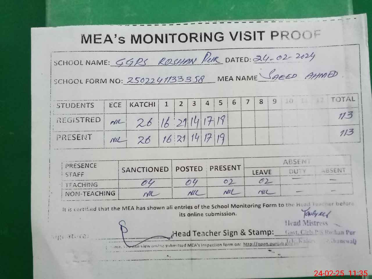 | Attendance Register | Head Teacher | MEA with School | Visit Proof |