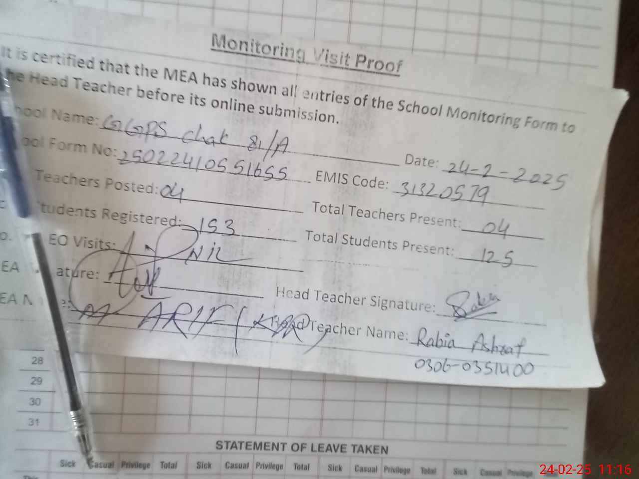 | Attendance Register | Head Teacher | MEA with School | Visit Proof |