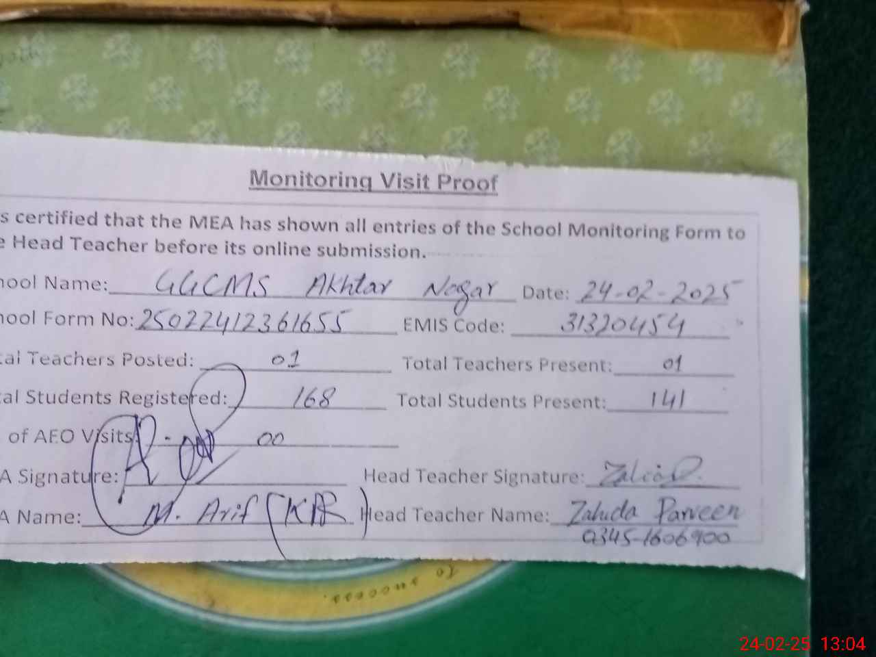 | Attendance Register | Head Teacher | MEA with School | Visit Proof |