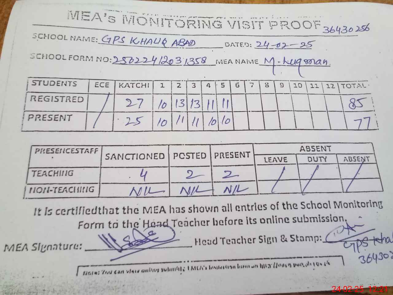 | EMIS Code: 36430256 | Name of School: GPS KHALIQ ABAD, P/O 11-A/8R, TULAMBA | |||