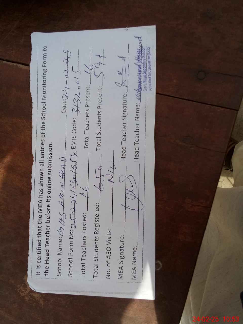 | Certified that this School was Inspected by the Undersigned MEA/DMO Today and the Information Stated Above is as Per Record. | |||||