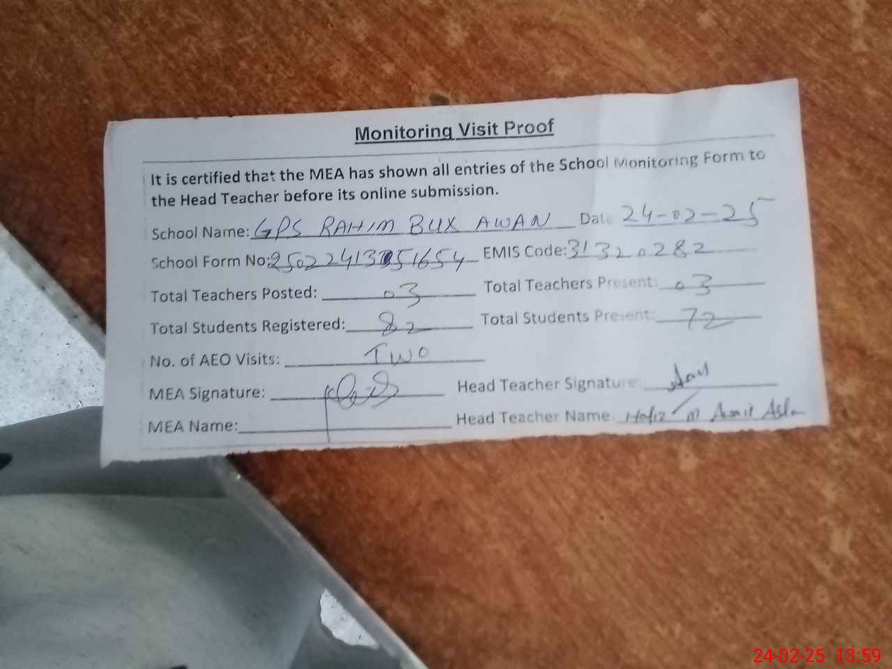 | EMIS Code: 31320282 | Name of School: GPS HAJI RAHIM BAKHASH AWAN | |||