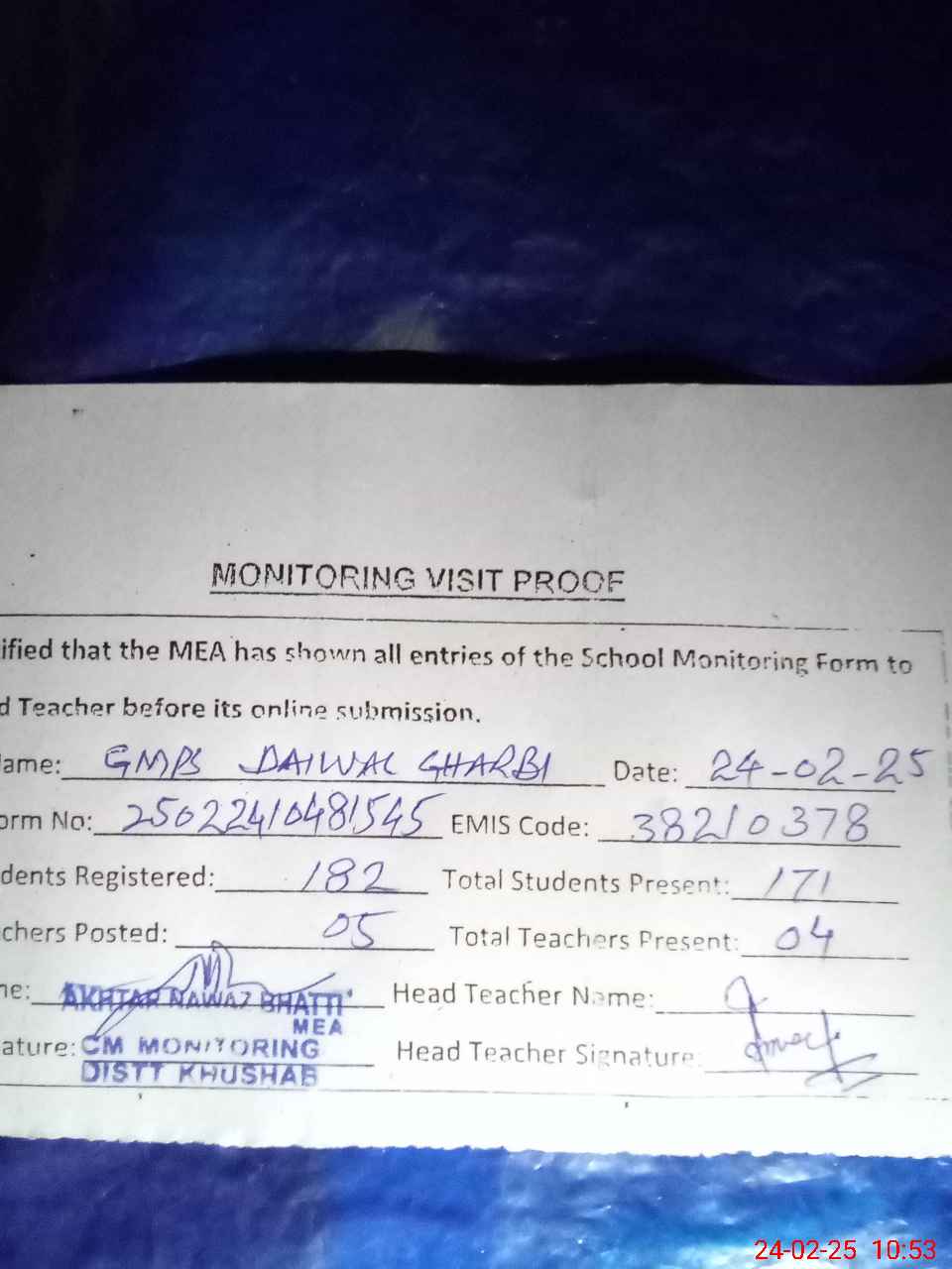 | EMIS Code: 38210378 | Name of School: GMPS DAIWAL GHARBI | |||