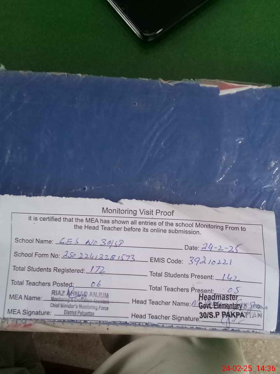 | Attendance Register | Head Teacher | MEA with School | Visit Proof |
