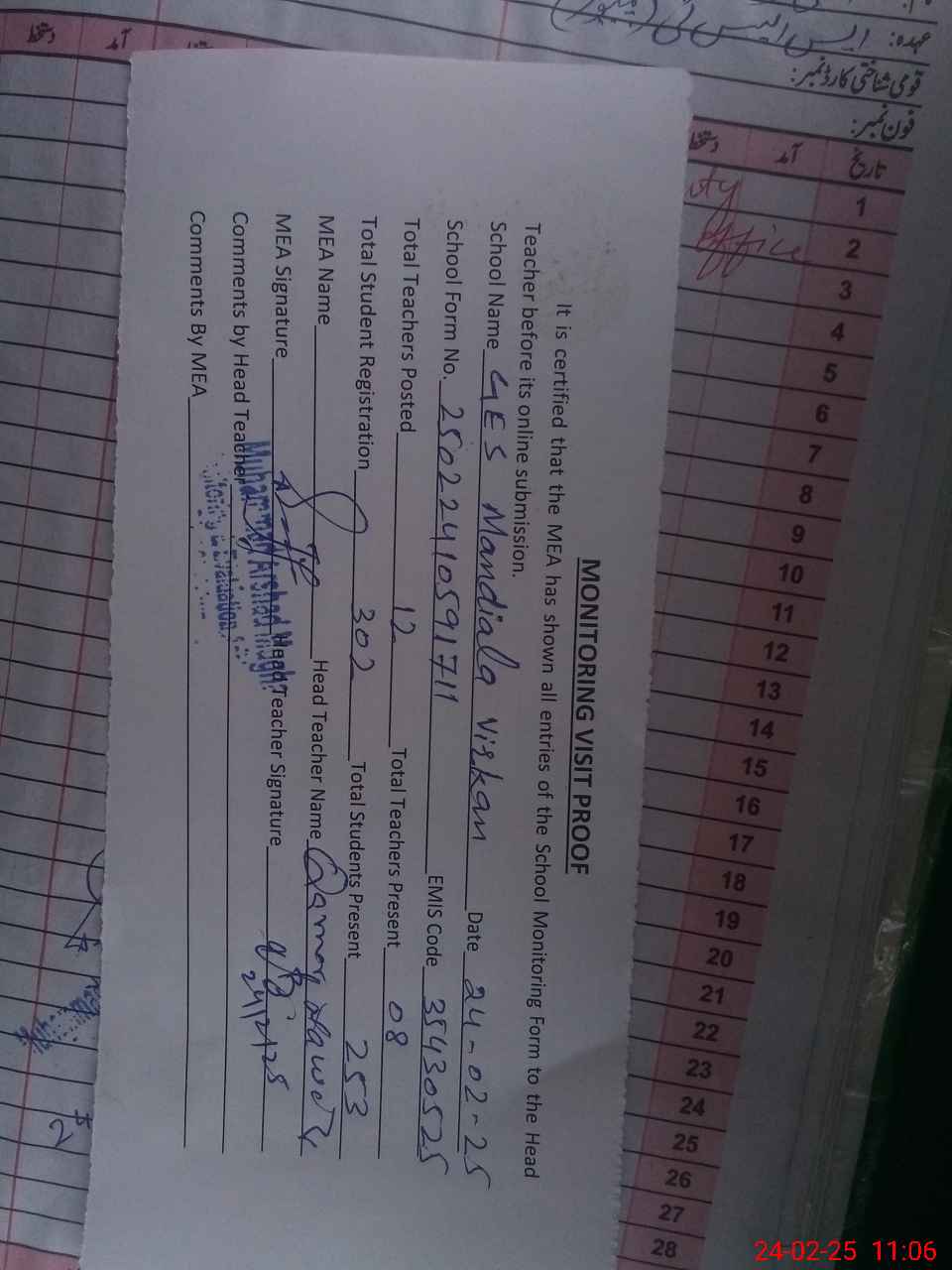 | Attendance Register | Head Teacher | MEA with School | Visit Proof |