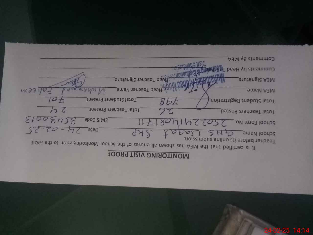 | Attendance Register | Head Teacher | MEA with School | Visit Proof |
