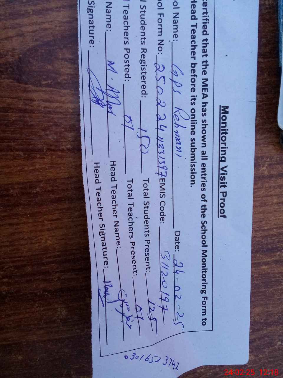 | Attendance Register | Head Teacher | MEA with School | Visit Proof |