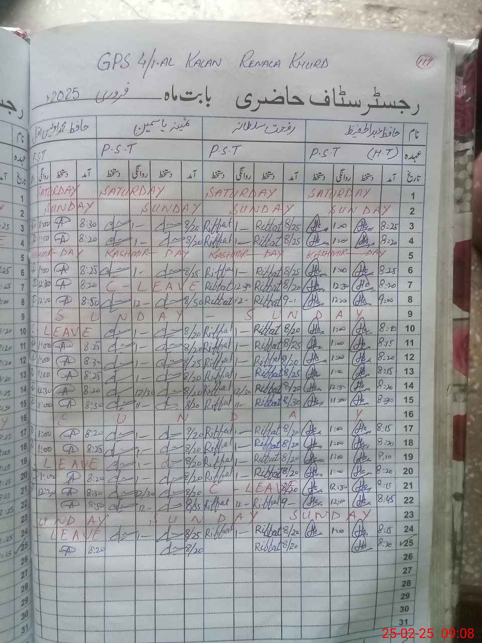 | CNIC | Full Name | Designation | R/C | Absence During Last Calender Month |