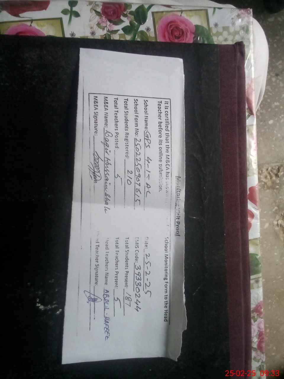 | Attendance Register | Head Teacher | MEA with School | Visit Proof |