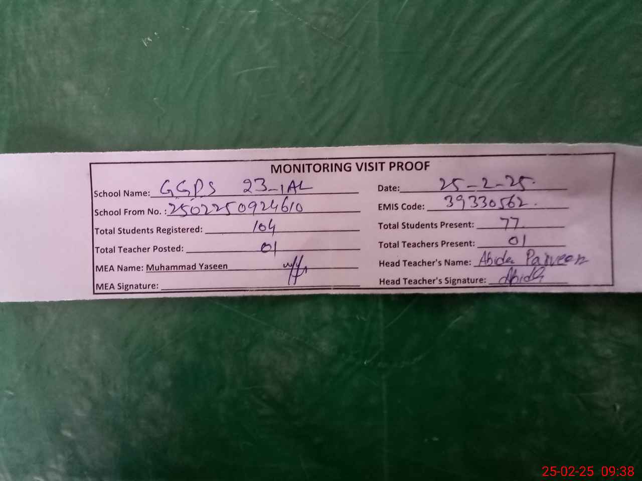 | Attendance Register | Head Teacher | MEA with School | Visit Proof |