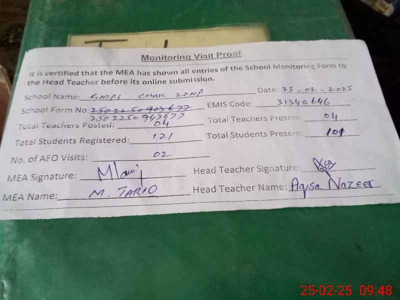 | EMIS Code: 31340646 | Name of School: GMPS CHAK NO.20/NP | |||