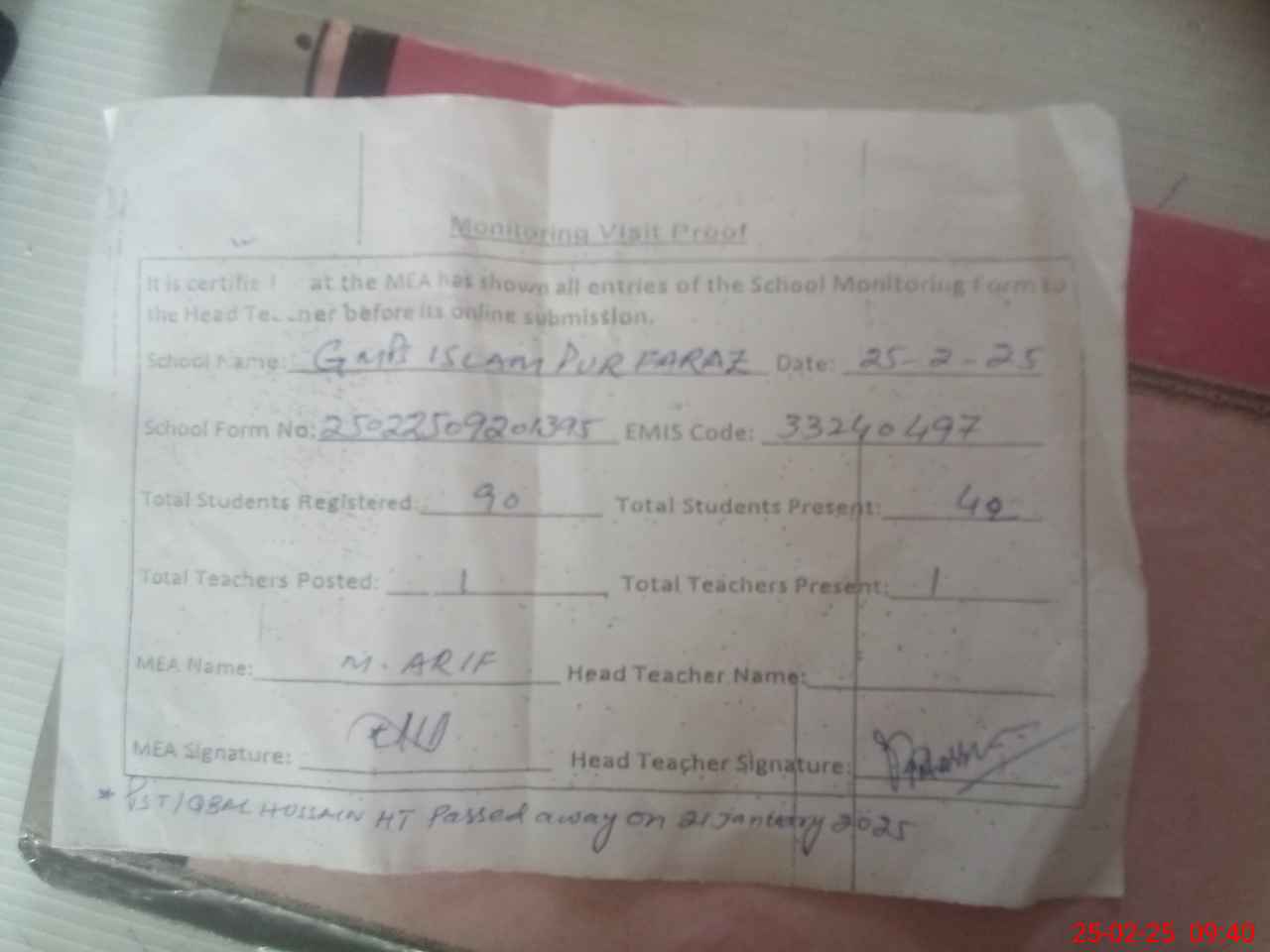 | Attendance Register | Head Teacher | MEA with School | Visit Proof |