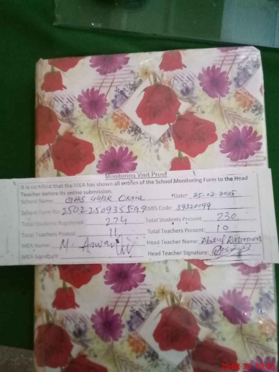 | Attendance Register | Head Teacher | MEA with School | Visit Proof |