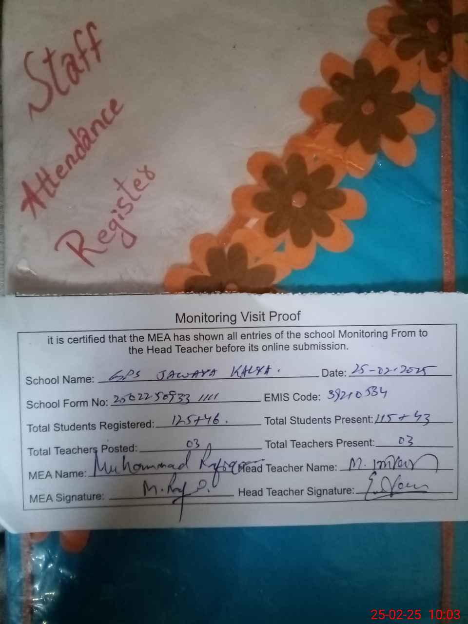 | Attendance Register | Head Teacher | MEA with School | Visit Proof |