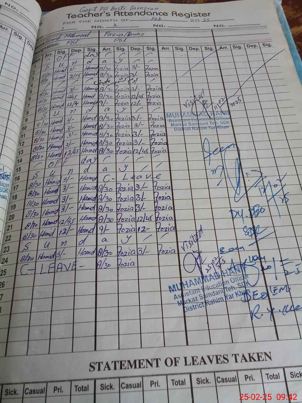 | CNIC | Full Name | Designation | R/C | Absence During Last Calender Month |