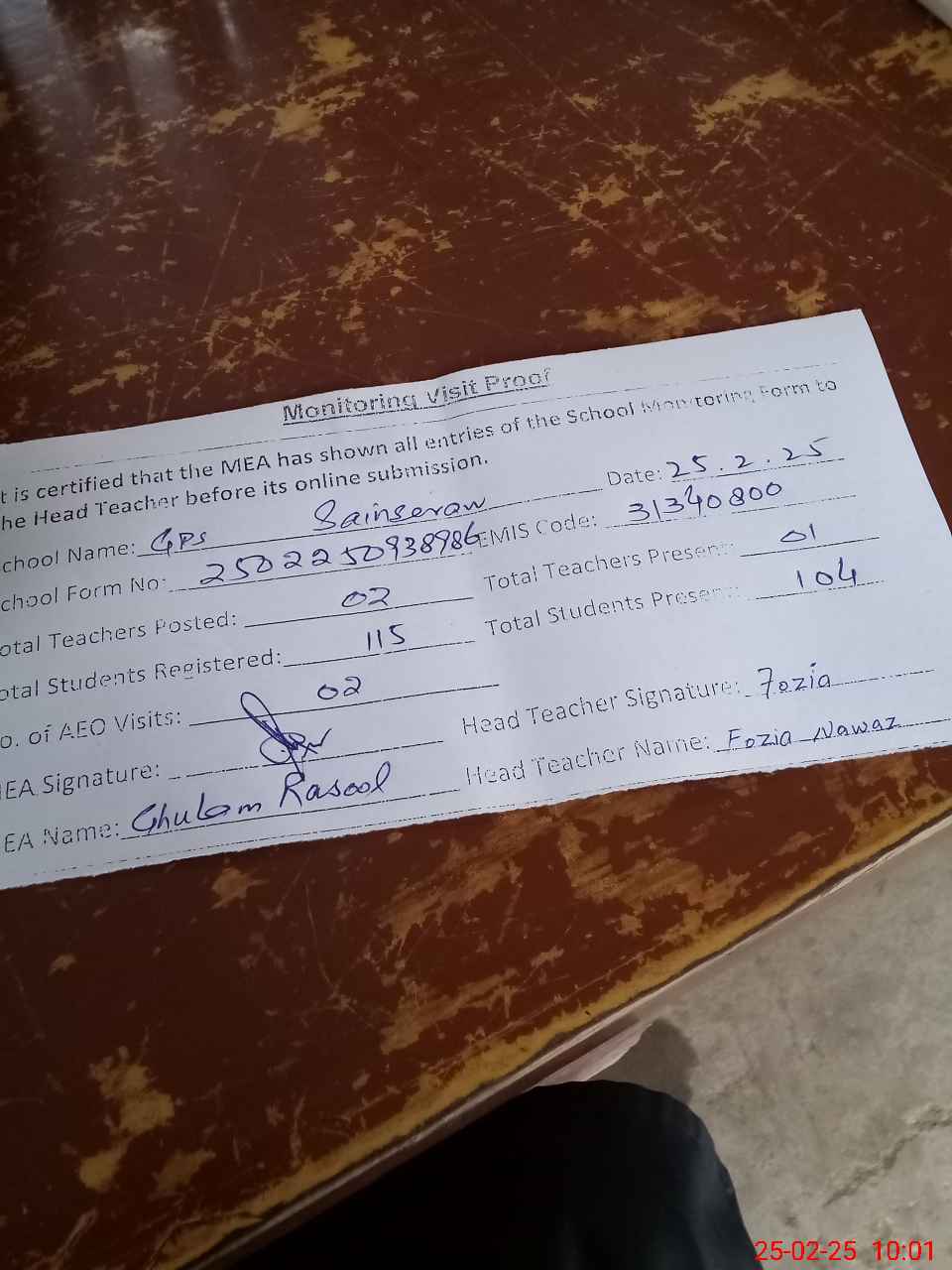 | Attendance Register | Head Teacher | MEA with School | Visit Proof |