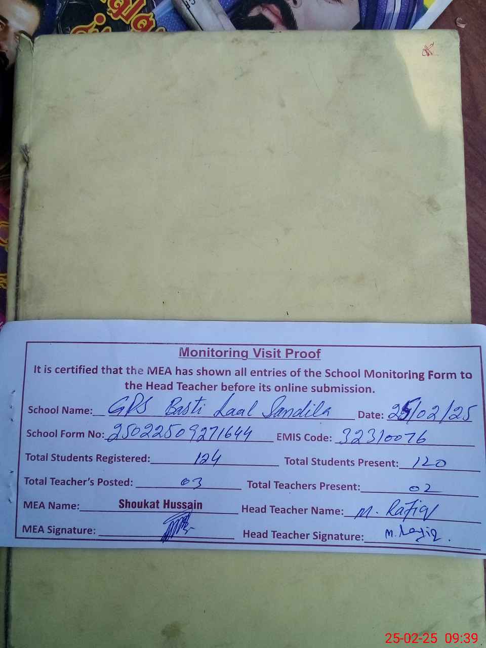 | Attendance Register | Head Teacher | MEA with School | Visit Proof |