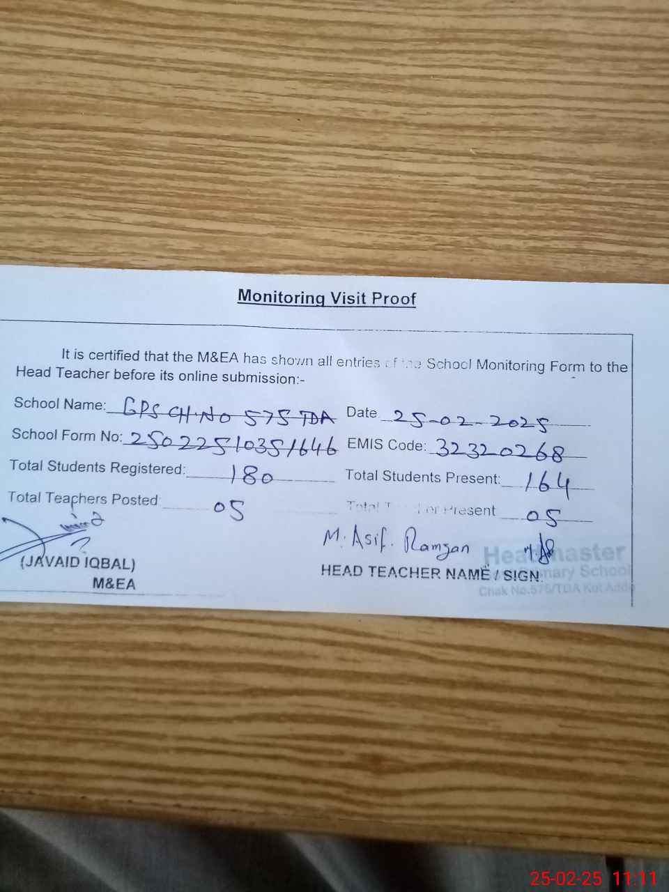 | Attendance Register | Head Teacher | MEA with School | Visit Proof |