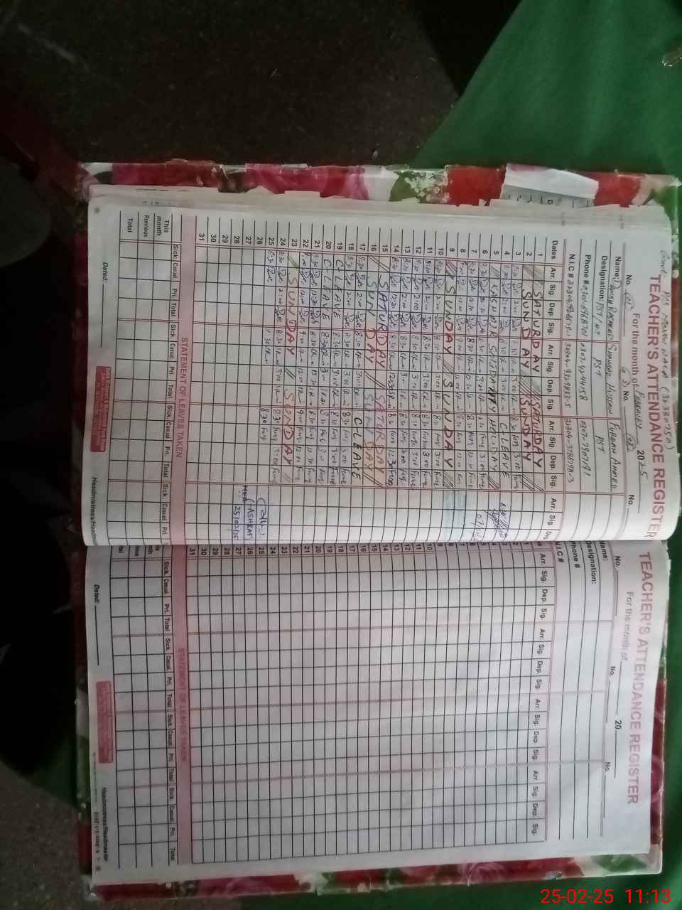 | CNIC | Full Name | Designation | R/C | Absence During Last Calender Month |