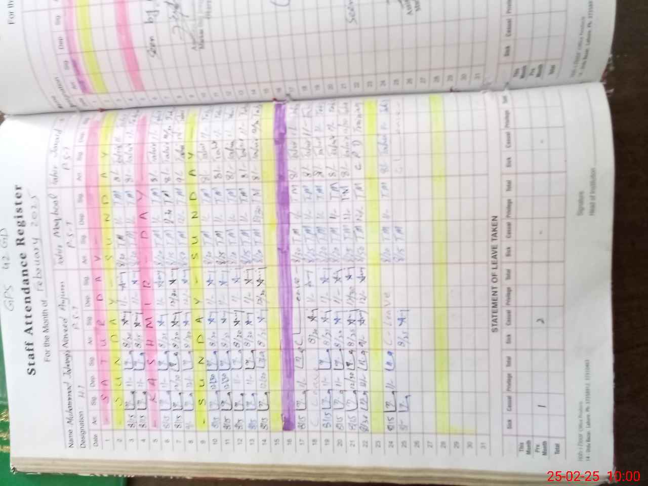 | CNIC | Full Name | Designation | R/C | Absence During Last Calender Month |