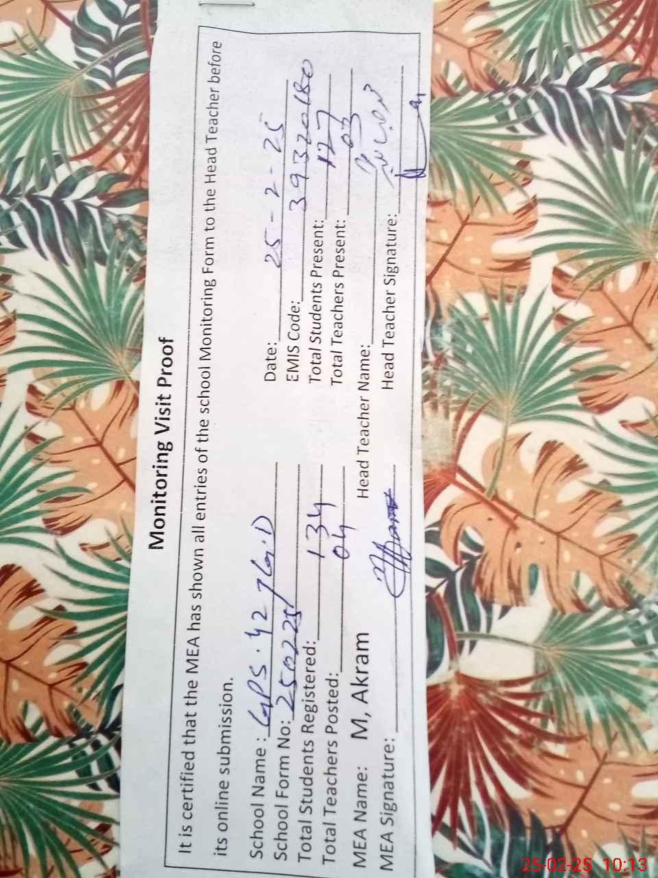 | Attendance Register | Head Teacher | MEA with School | Visit Proof |