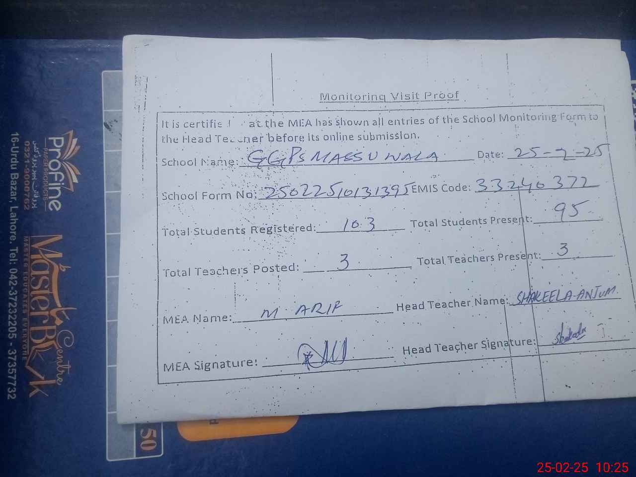 | Attendance Register | Head Teacher | MEA with School | Visit Proof |