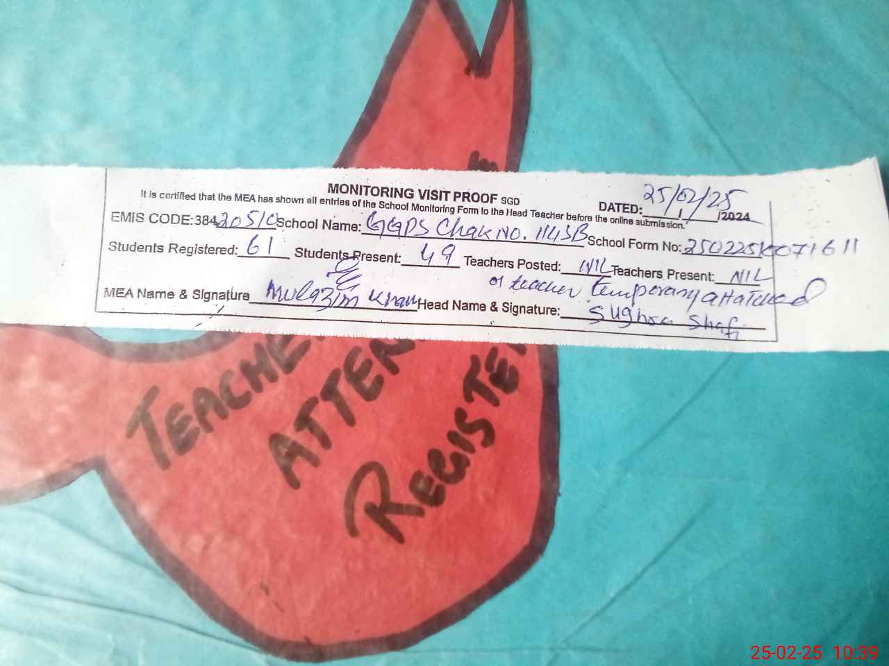 | Attendance Register | Head Teacher | MEA with School | Visit Proof |