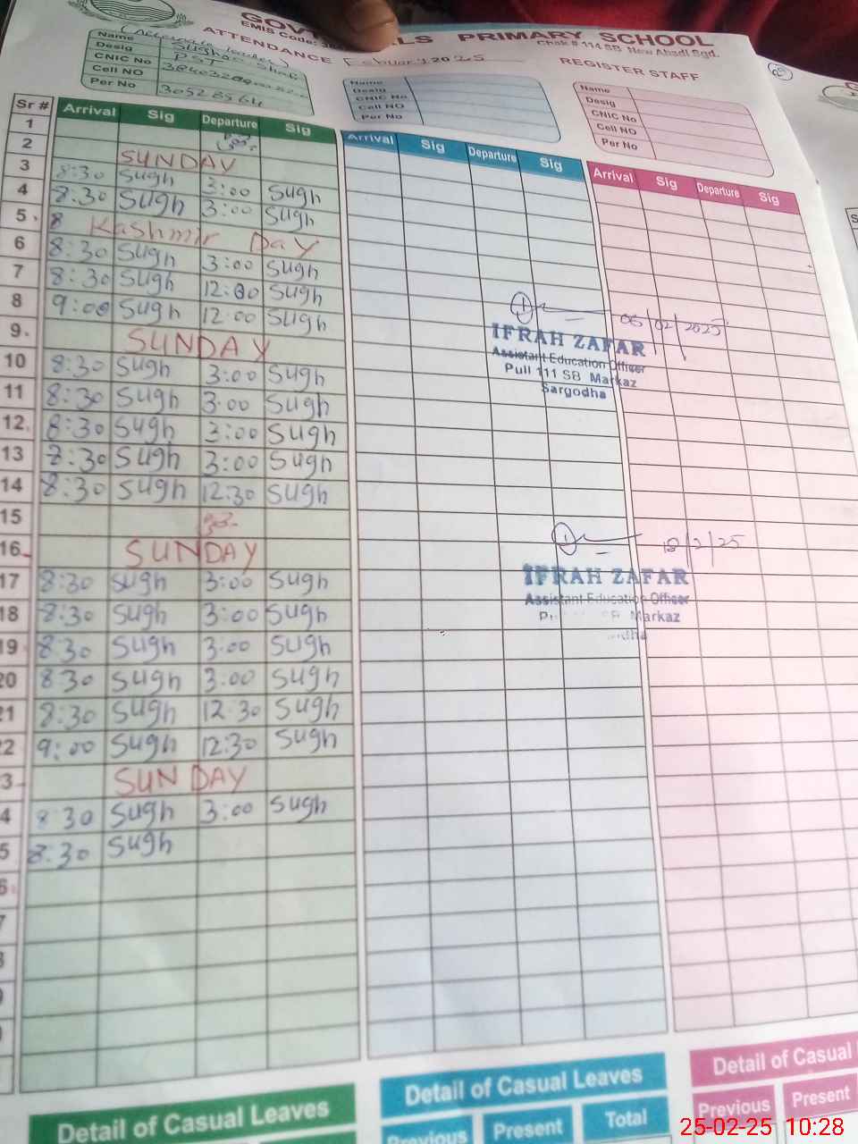 | CNIC | Full Name | Designation | R/C | Absence During Last Calender Month |