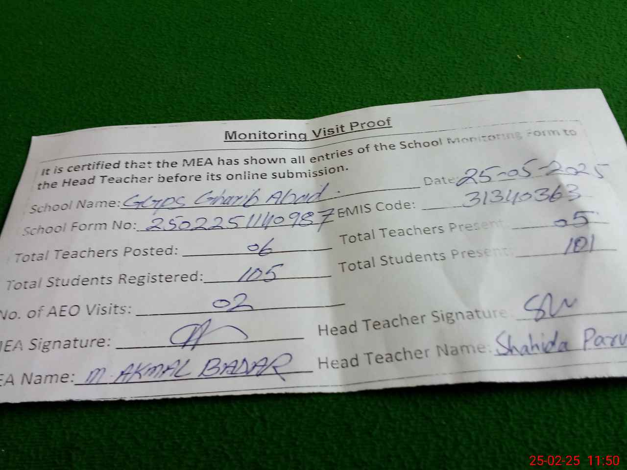 | Attendance Register | Head Teacher | MEA with School | Visit Proof |