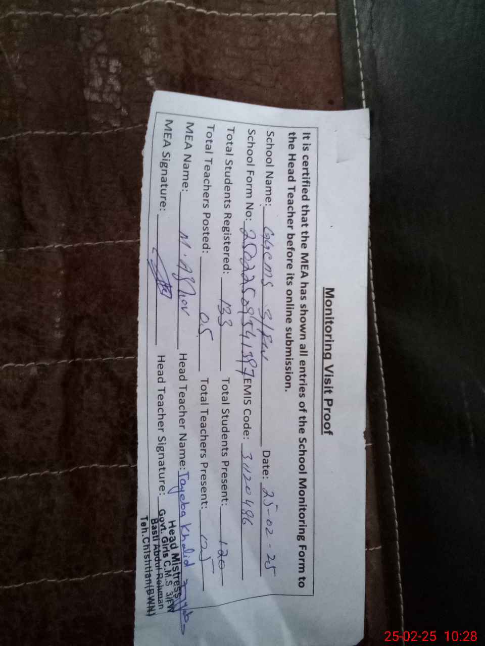 | Attendance Register | Head Teacher | MEA with School | Visit Proof |
