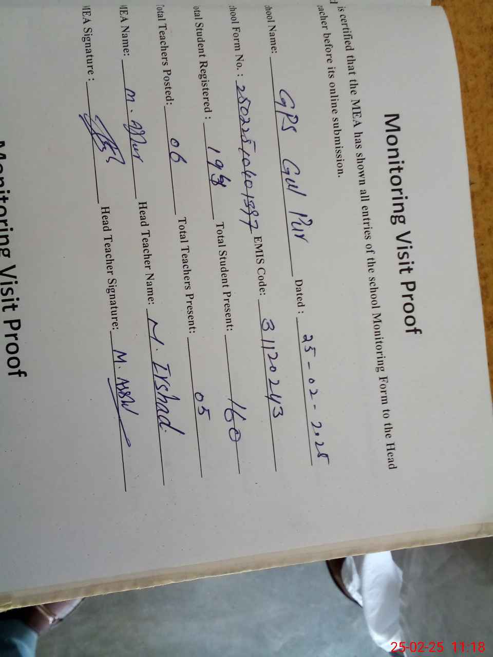 | Attendance Register | Head Teacher | MEA with School | Visit Proof |