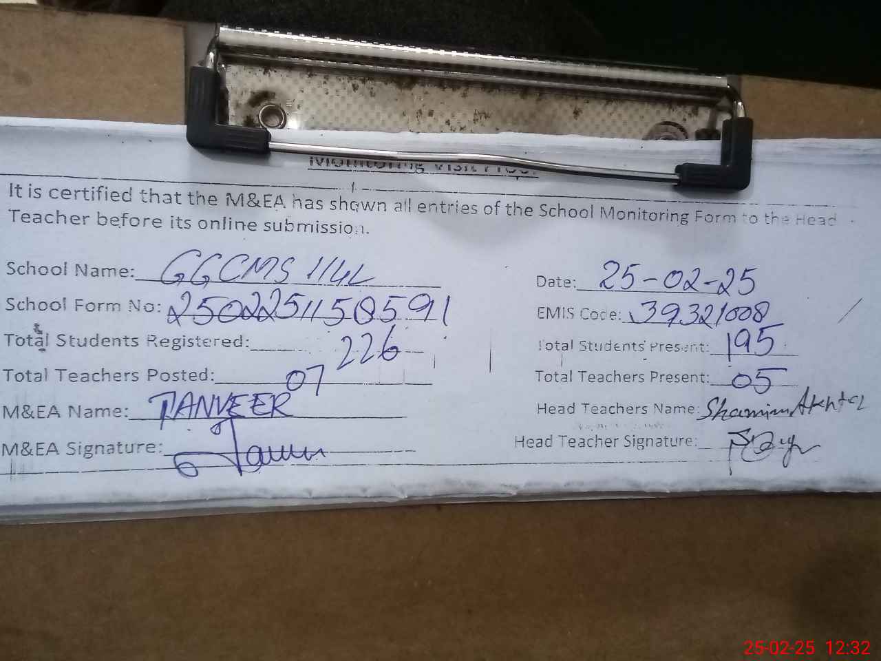 | Attendance Register | Head Teacher | MEA with School | Visit Proof |