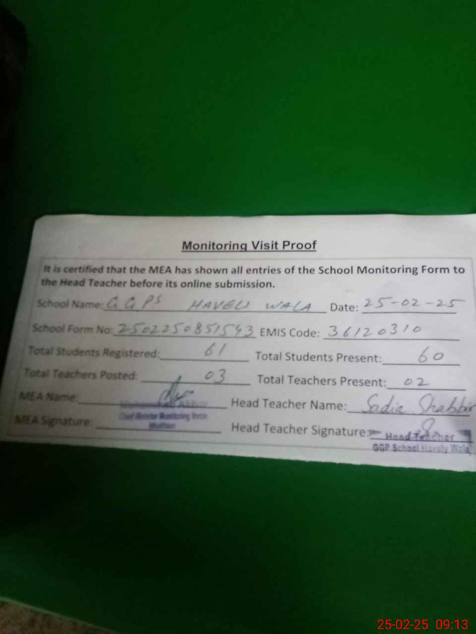 | Attendance Register | Head Teacher | MEA with School | Visit Proof |