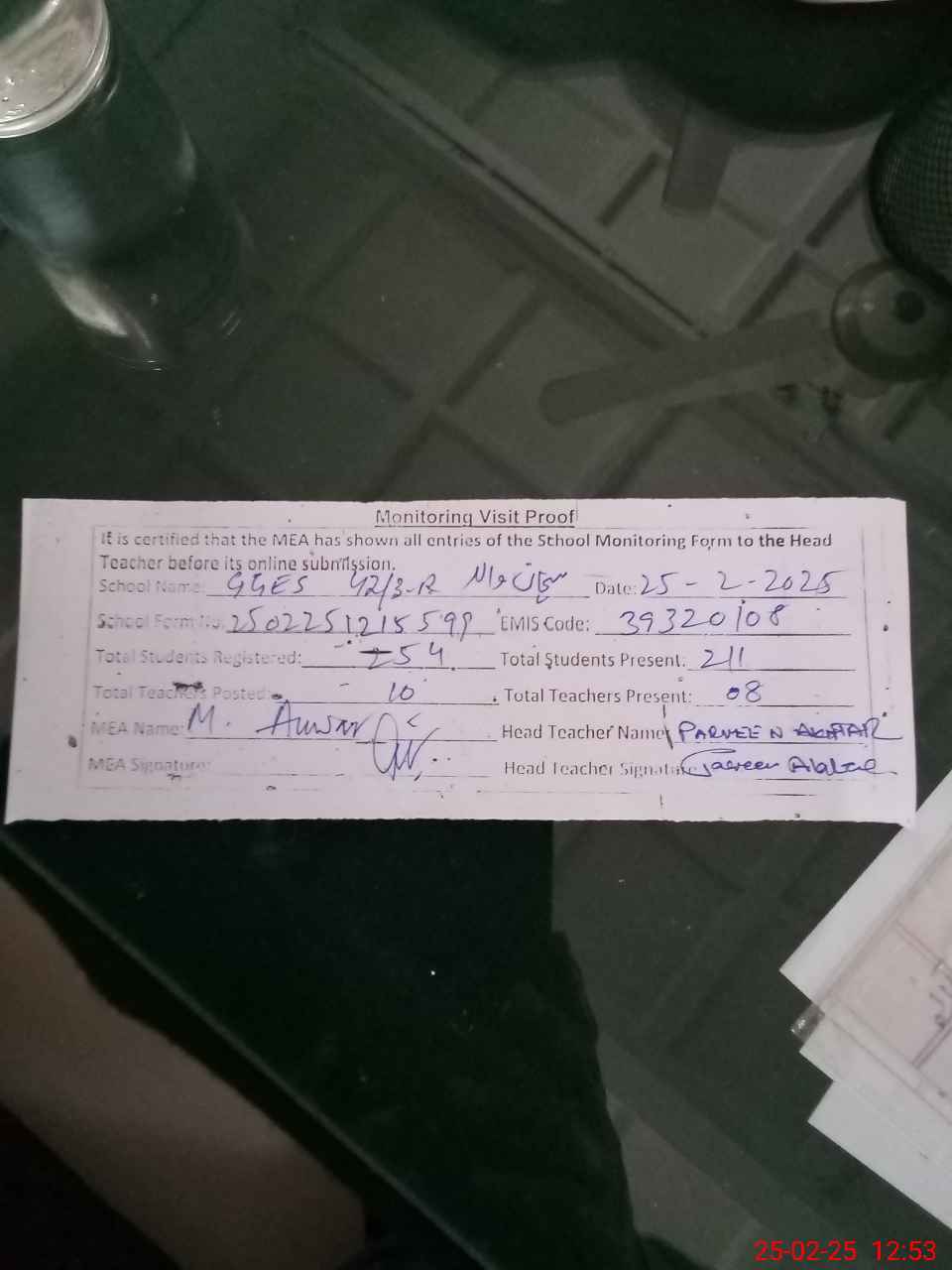 | Attendance Register | Head Teacher | MEA with School | Visit Proof |