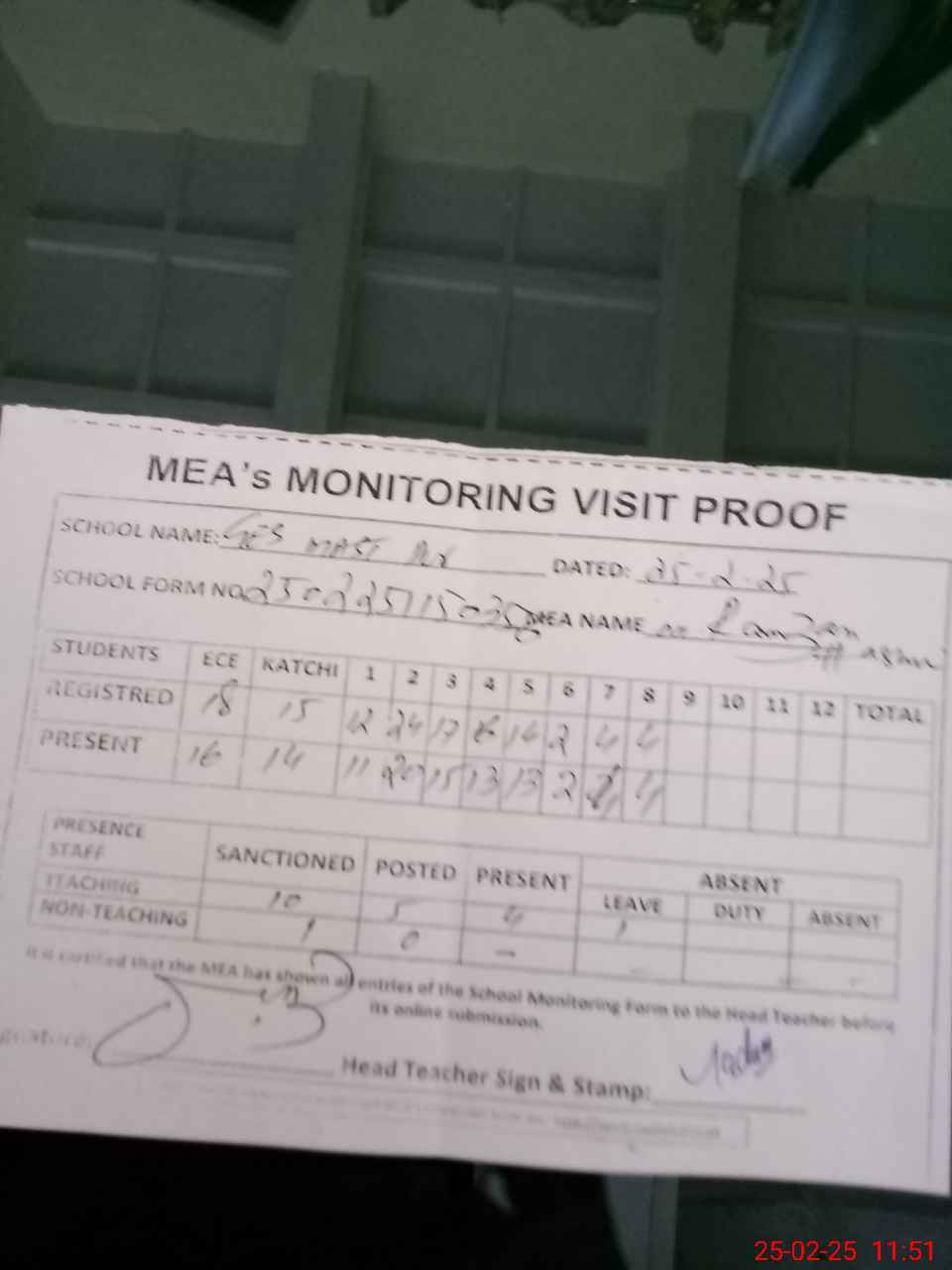 | Attendance Register | Head Teacher | MEA with School | Visit Proof |
