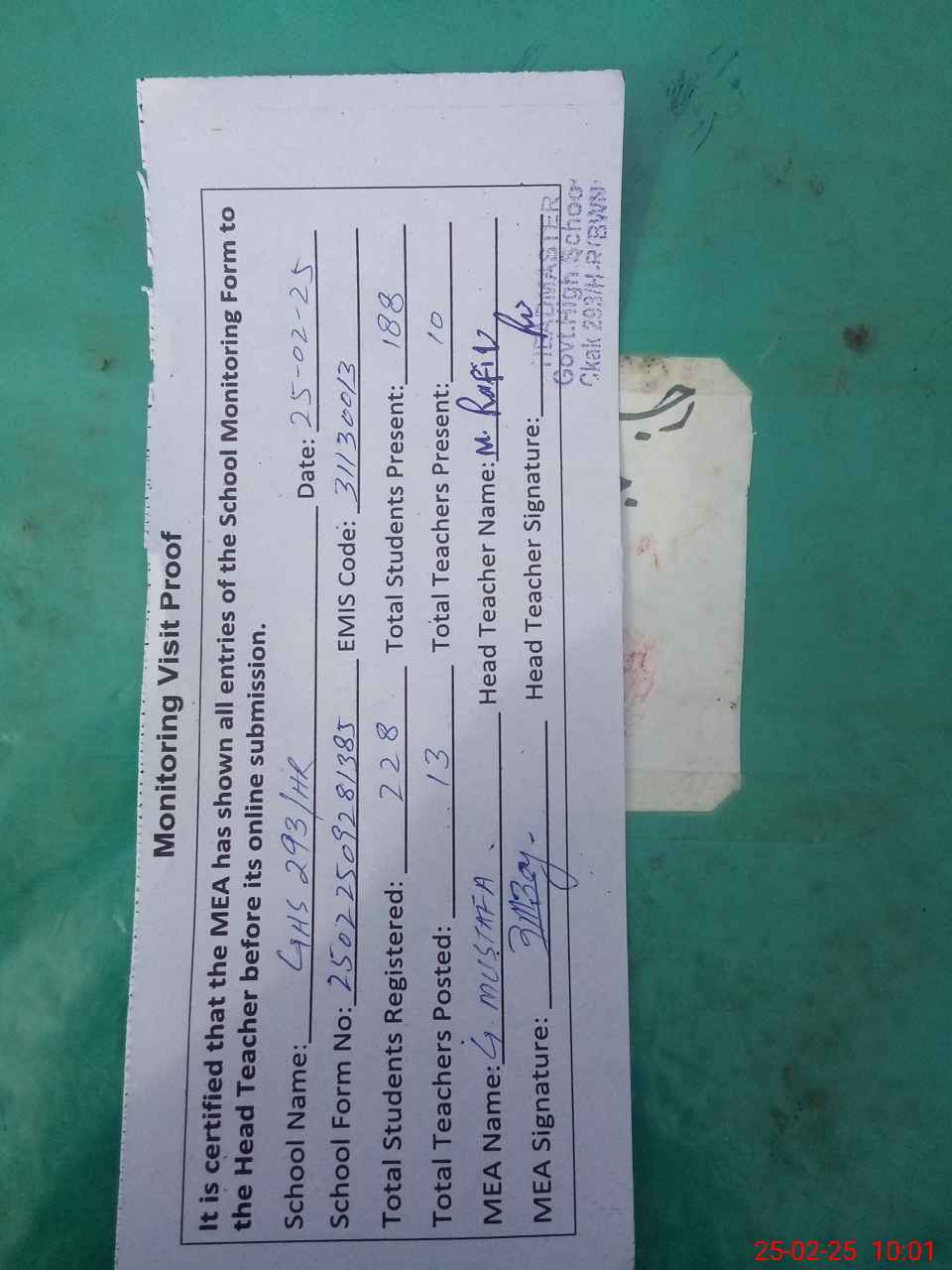| Attendance Register | Head Teacher | MEA with School | Visit Proof |