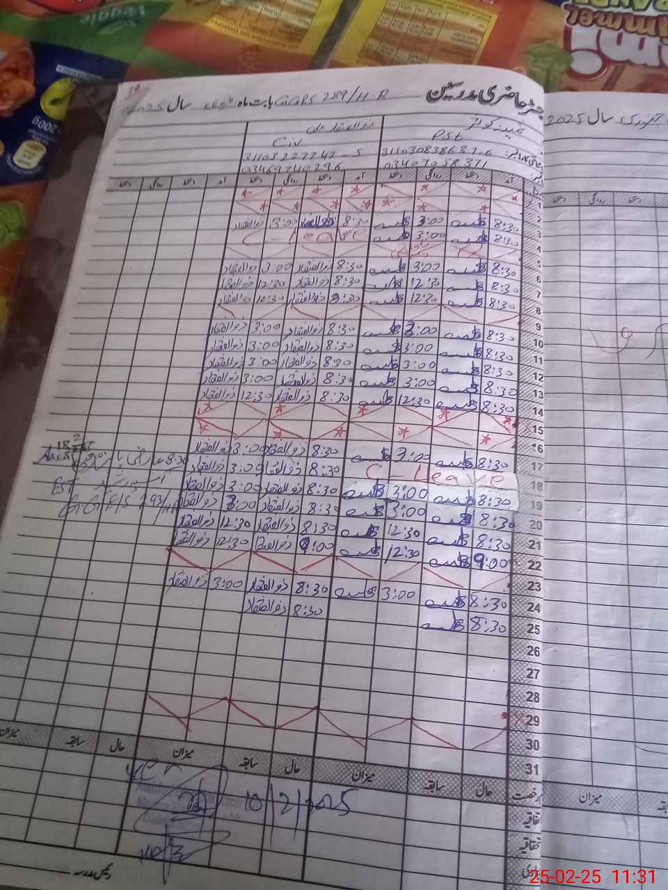 | CNIC | Full Name | Designation | R/C | Absence During Last Calender Month |