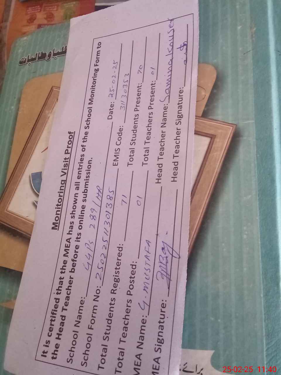 | Attendance Register | Head Teacher | MEA with School | Visit Proof |