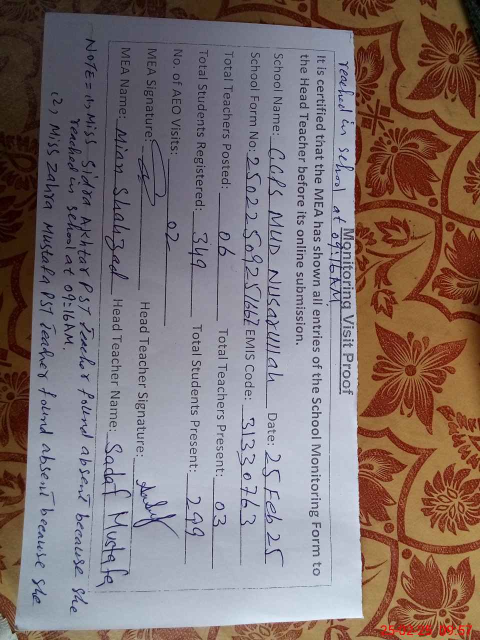 | Attendance Register | Head Teacher | MEA with School | Visit Proof |
